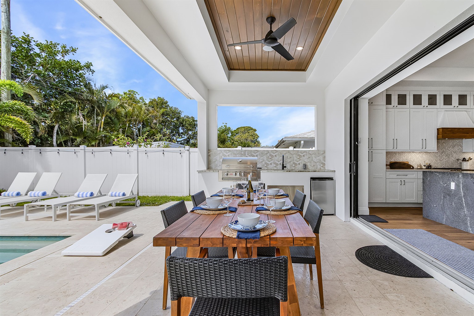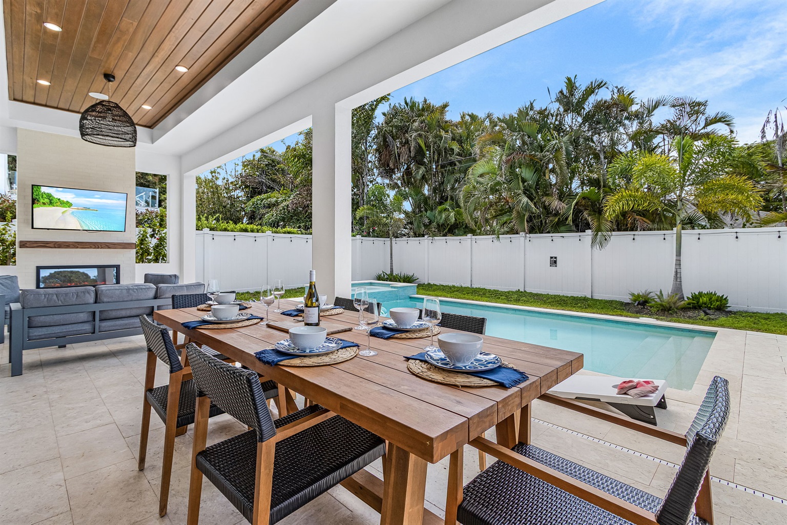 4 Bedrooms • 3 Bathrooms 3 Baths • Sleeps 5-8The highlight of the home is the private backyard oasis, featuring a saltwater pool and spa—ideal for cooling off during sunny Florida days or relaxing in the evening. A covered lanai offers a fully equipped grilling area, outdoor dining space, and smart TV, making it easy to enjoy meals, movie nights, or live sports while spending time outdoors. The fenced yard adds privacy and a peaceful setting for guests to unwind.